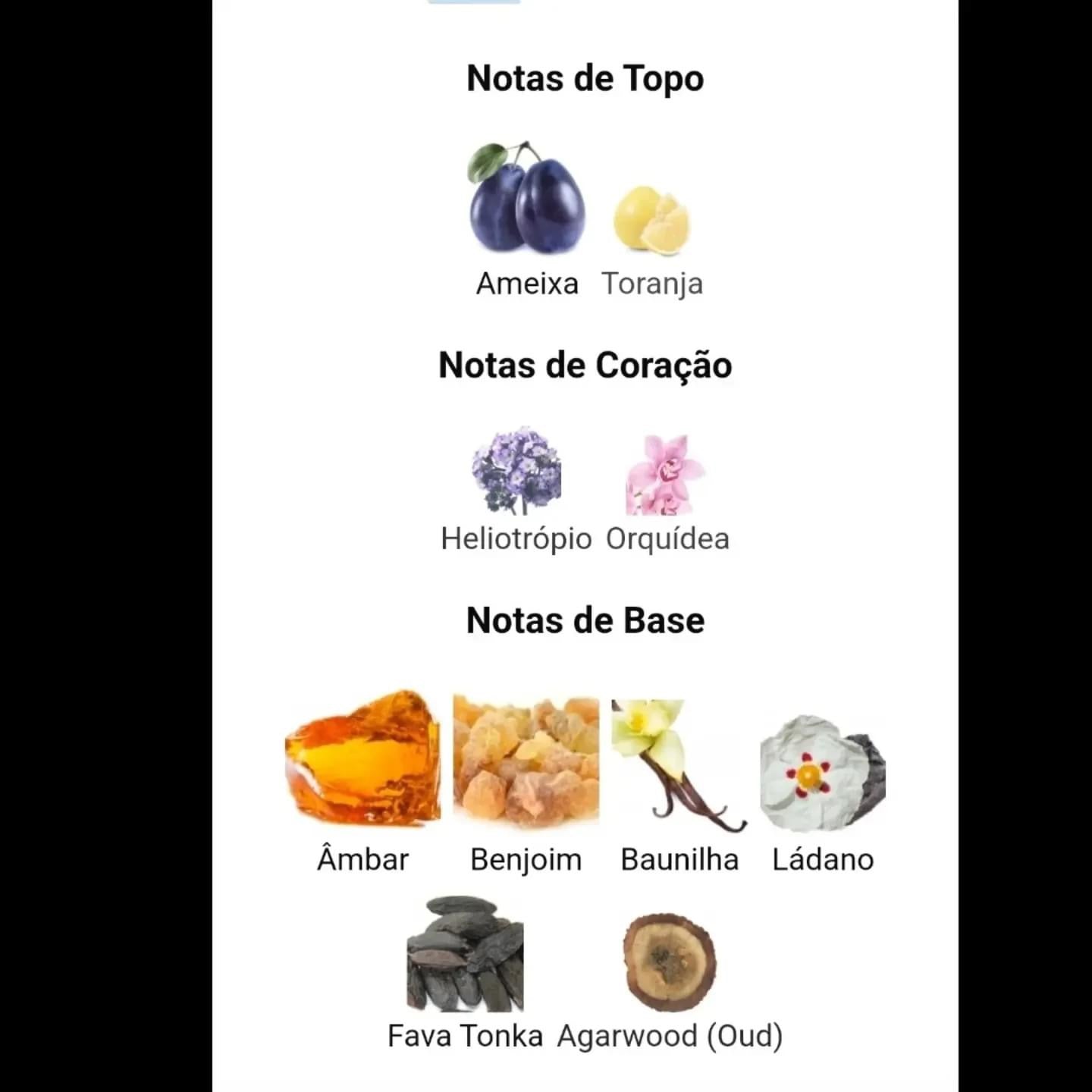 As notas de topo são Ameixa e Toranja; as notas de coração são Heliotrópio e Orquídea; as notas de fundo são Benjoim, Âmbar, Baunilha, Fava Tonka, Ládano e Agarwood (Oud).