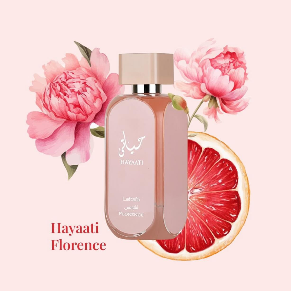 O Hayaati Florence abre com uma explosão de cítricos brilhantes como bergamota e limão, que proporcionam um toque refrescante e energizante. Notas florais como rosa e jasmim entrelaçam-se com a doçura do pêssego e da groselha preta, e criam um corpo floral e frutado que evoca imagens dos jardins florentinos.